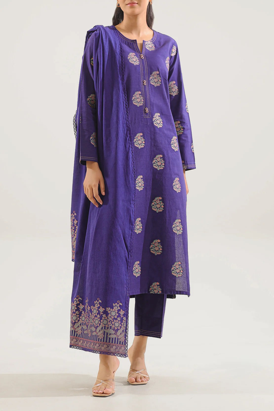 To complete the trio, this suit includes a Premium Dyed Cambric Trouser (2.5m), stitched from soft yet durable winter-friendly cambric. The trouser fabric ensures comfort, smoothness, and flexibility, making it suitable for long wear during colder months. Its deep royal blue shade aligns perfectly with the shirt and dupatta, creating a seamless, polished appearance from head to toe.