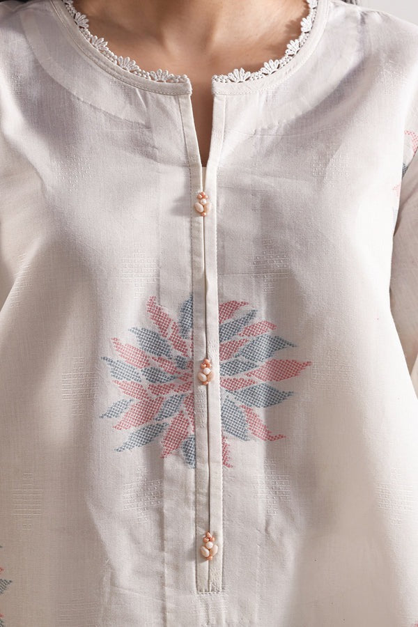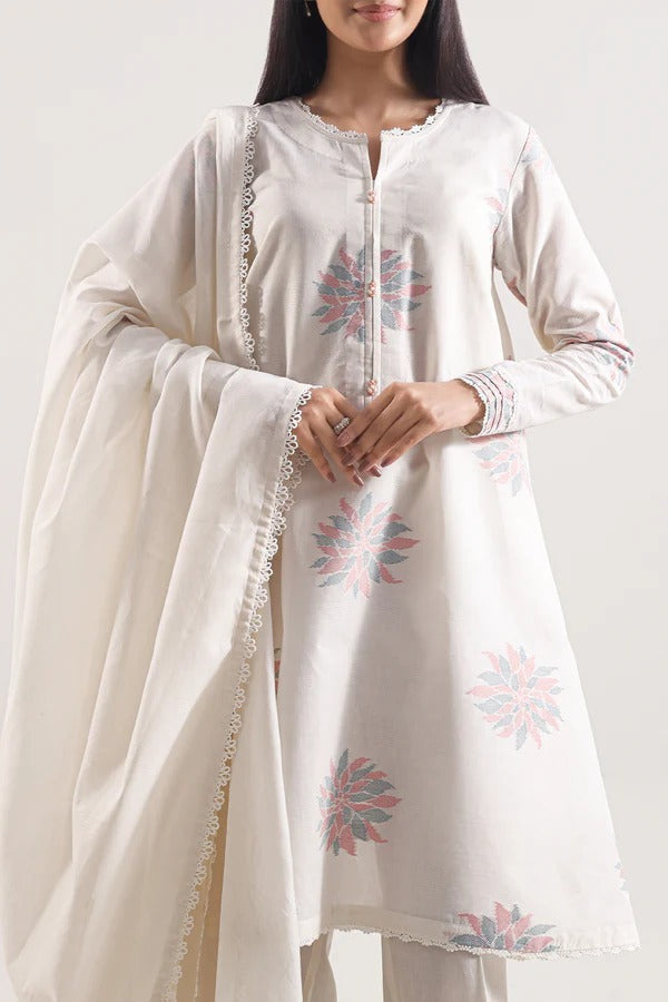 Enhancing the ensemble is the Premium Dyed Jacquard Dupatta (2.5m) in matching soft ivory. Lightweight, breezy, and luxurious, it drapes effortlessly and adds a whisper of elegance to every step you take. Its delicate craftsmanship makes it a statement piece on its own—ideal for pairing with minimal jewelry to maintain a soft, graceful look.