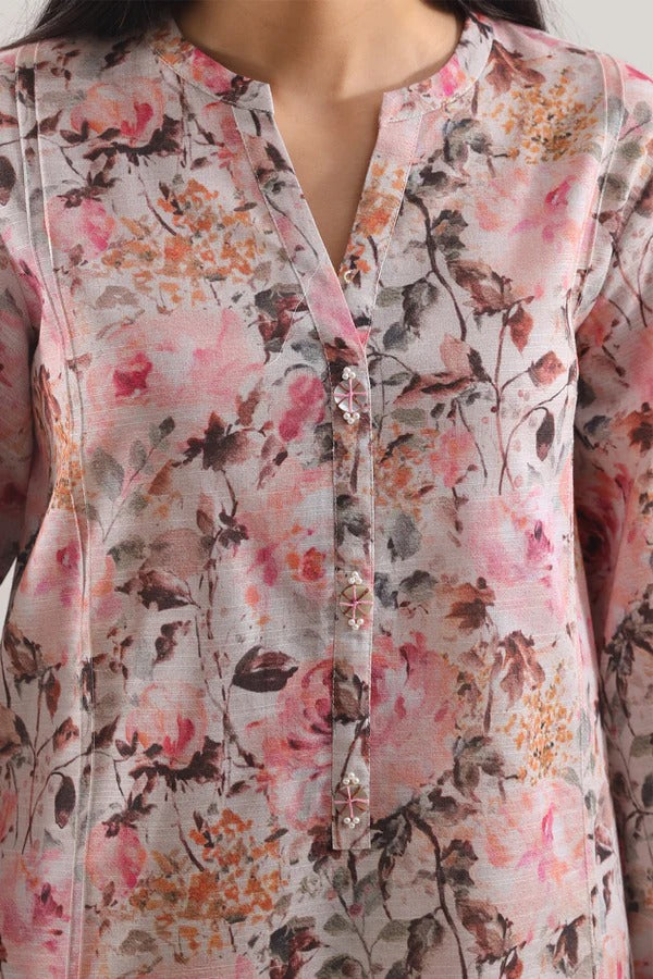 The premium printed cotton khaddar shirt, tailored from a wider 1.75m fabric, features a relaxed fit that flows naturally with movement. The print is a harmonious blend of soft pinks, muted greys, subtle lilacs, and delicate floral accents, giving the suit a dreamy, watercolor-inspired appearance. With its full sleeves and gently structured neckline, the shirt offers the perfect balance of style and comfort for cold-weather dressing.