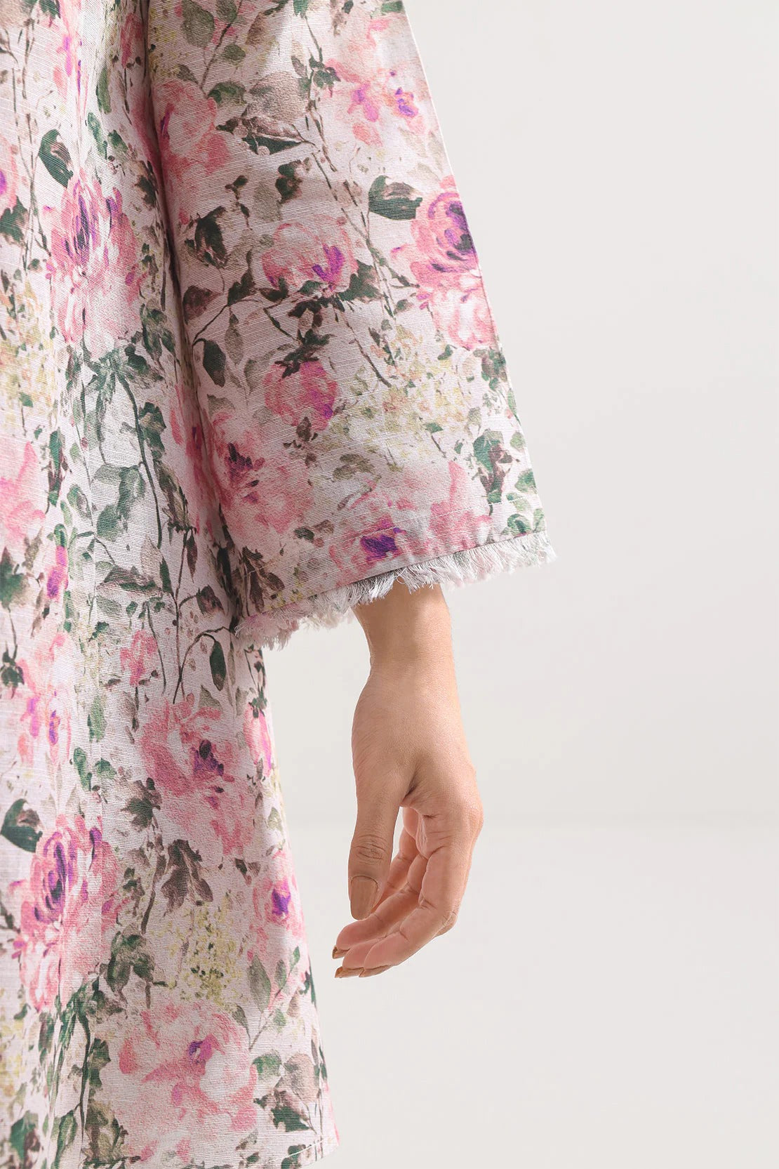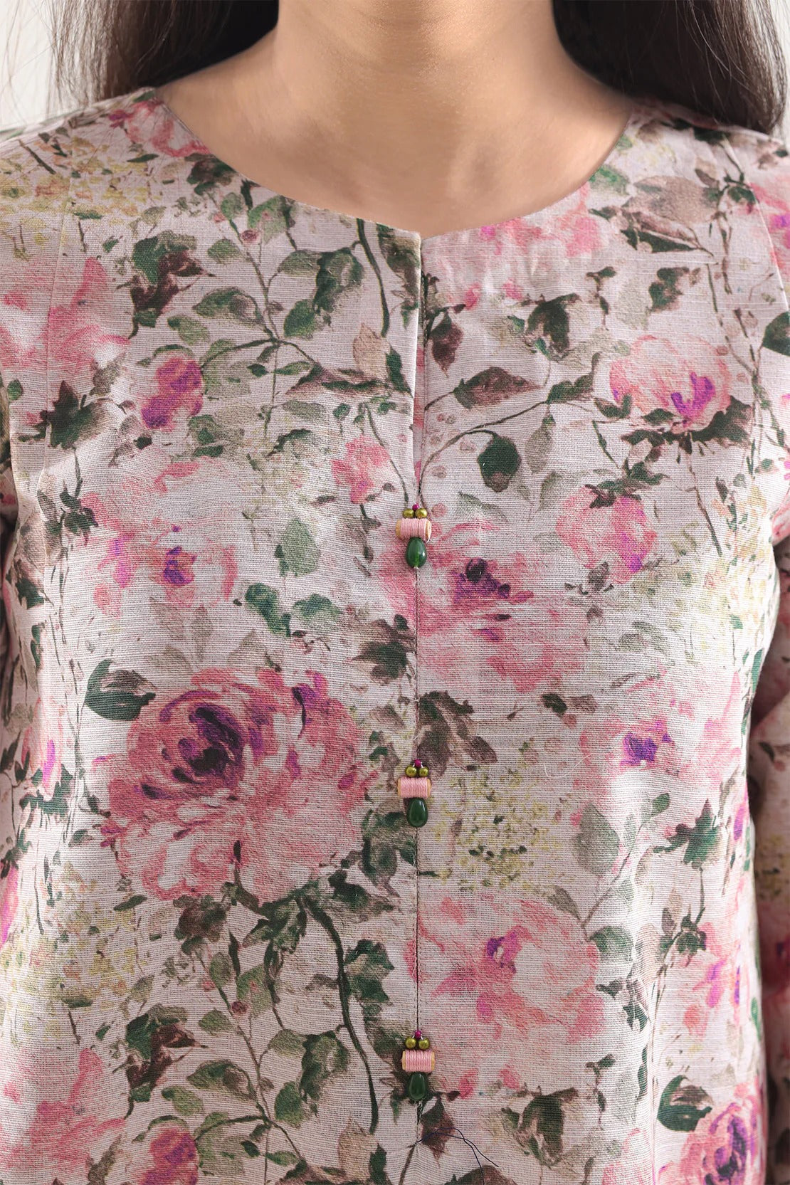 The outfit features a beautifully detailed premium printed cotton khaddar shirt, tailored from a wider-width 1.75m fabric that offers an effortless fall and a comfortable, relaxed fit. The design showcases a captivating palette of soft pinks, delicate mauves, romantic whites, and hints of charcoal, arranged into a dreamy, blooming floral pattern. The print gives the shirt an artistic, almost watercolor effect, creating a refreshing yet sophisticated look that complements all skin tones.