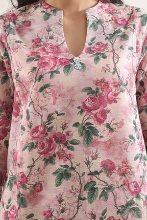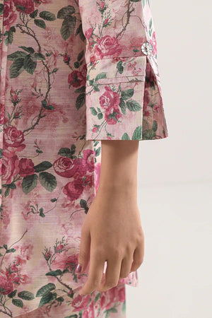 Crafted from premium printed cotton khaddar, the shirt is cut from a wider-width 1.75m fabric that enhances both comfort and stitching flexibility. The soothing base shade is adorned with lush, soft rose florals in tones of pink, mauve, plum, and dusty greys—giving the outfit a romantic, garden-inspired look. The print feels refreshing yet classic, beautifully complementing winter aesthetics while maintaining a timeless appeal.